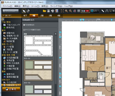 間取り画面のナビで「図面装飾/出力」を選択します。パレットで「テイストを変えて出力」から、プランにあったテイストを選択します。