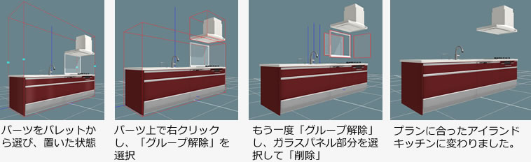 アイランドキッチンで提案するため、ガラスパネルを削除します。