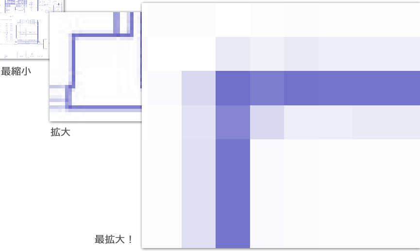 細かい入力、線を合わせる時などなど、大きく見えた方が良いときには、画面上部の虫眼鏡のボタンや、マウスのホイールを上下に回転させて拡大/縮小させることができます。