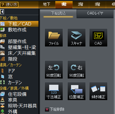 ナビボタンの「下絵/CAD」ボタンをクリックして、取り込む対象を選択。