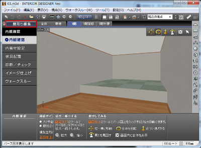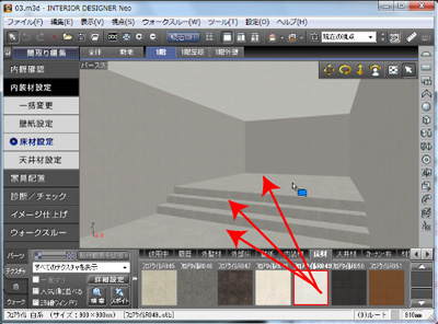 ナビから「内装材設定」の「床材設定」を選び、「テクスチャ」タブの「床材」からフロアタイルを床に貼りつけて、終了です。