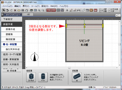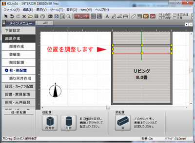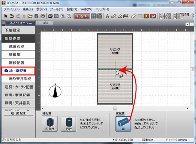 「インテリアデザインナビ」から「柱・梁配置」を選択し、梁配置ボタンをクリックして下のリビングの部屋に「梁」を配置します。