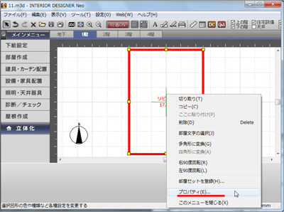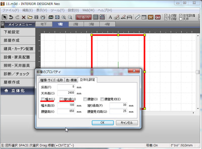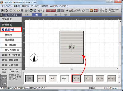 間取り画面のナビから「部屋作成」を選択します。部屋を配置した後に広さを調整します。 |