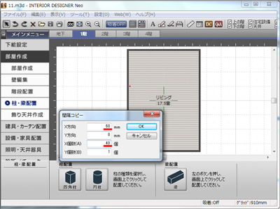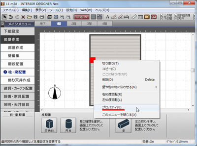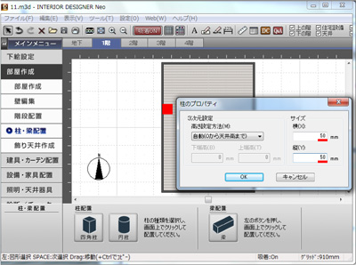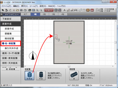 次に「柱・梁配置」を選択し、下のパレットの「四角柱」をクリックして部屋に配置します。 |