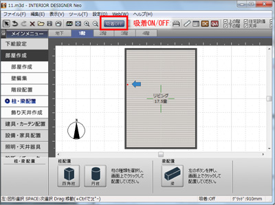 吸着ON」をクリックして「吸着OFF」にした後に、数値変更した柱を移動します。 |