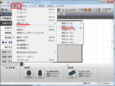 柱が赤く選択された状態を確認して「編集」→「特殊コピー」→「間隔コピー」を選択します。 |