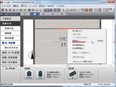 部屋を拡大して余分な柱を選択。右クリックから削除を選びます。