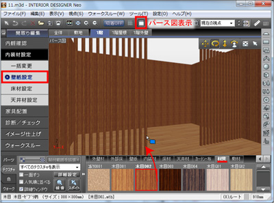 パース図表示にします。壁紙設定ナビから材質の木目のテクスチャを貼ります。 |