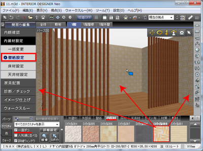 パレットの「一面づつにチェック」を入れて内装材のテクスチャを壁に貼ります。 |