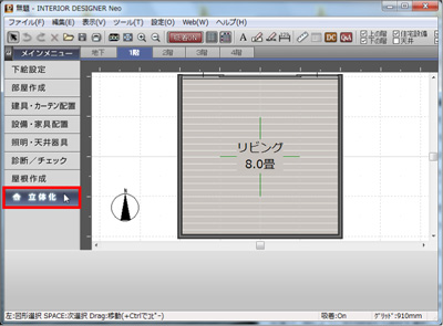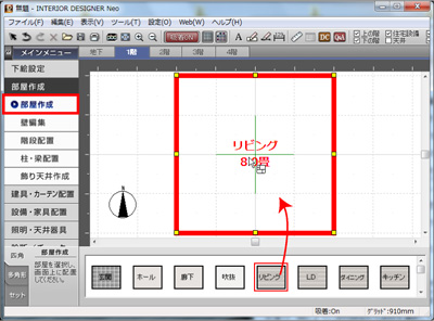 間取り画面のナビから「部屋作成」を選択し、部屋を配置します。 |
