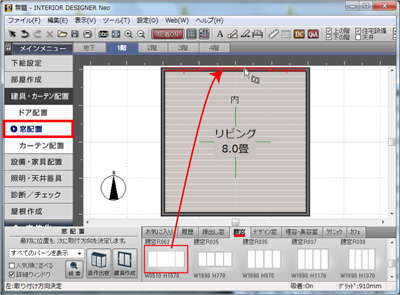 「窓配置」を選択して腰窓を部屋の奥の壁に配置します。 |