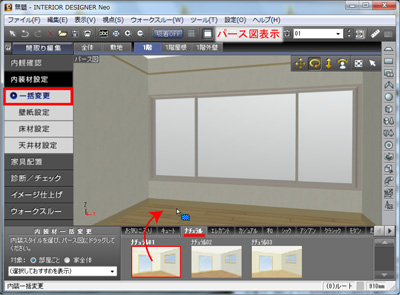 パース図表示にして「一括変更」の「ナチュラル」を選択後、内装を変更します。 |