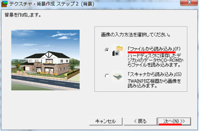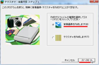 テクスチャ・背景作成ウィザードが表示されます。「背景画像を作成します」を選択して「次へ」をクリックします。 |