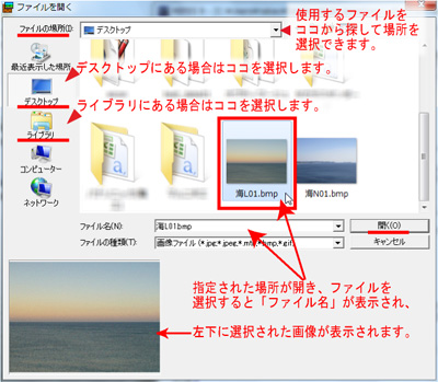 「ファイルを開く」画面が表示されます。自分が用意した画像を選択するには、ファイルの置いている場所を指定します。デスクトップに置いた場合はデスクトップを指定します。ライブラリの中のドキュメントやピクチャに置いた場合は「ライブラリ」を指定します。指定した場所から用意した画像を選択して、「開く」をクリックします。