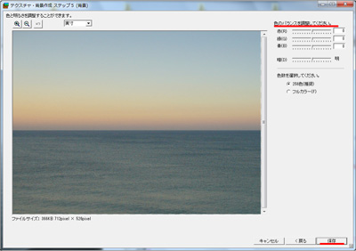 「テクスチャ・背景作成ステップ5(背景)」が表示されます。ここでは色と明るさの調整ができます。必要に応じて調整した後に「保存」をクリックします。
