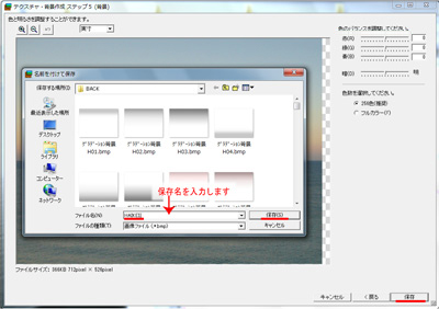 「名前を付けて保存」が表示されます。自動的に背景のファイルを収録しているフォルダが開きます。ファイル名を入力して「保存」をクリックします。