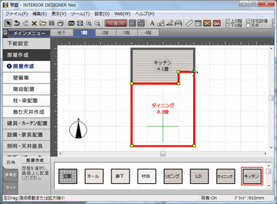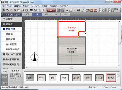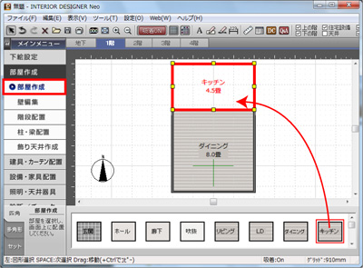 間取り画面のナビから、「部屋作成」を選択し、ダイニングとキッチンの部屋を配置します。 |
