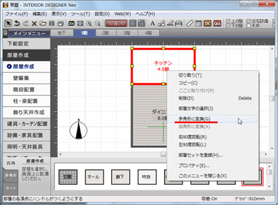 キッチンの部屋を選択して右クリックの「多角形に変換」を選択します。 |