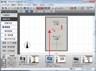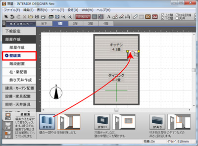 「壁編集」から「壁削除」を選択して不必要な壁を削除します。 |