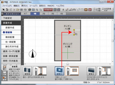 キッチンとダイニングの間にある残りの壁の中間に穴をあけます。「壁開口」を選択して壁をクリックします。 |