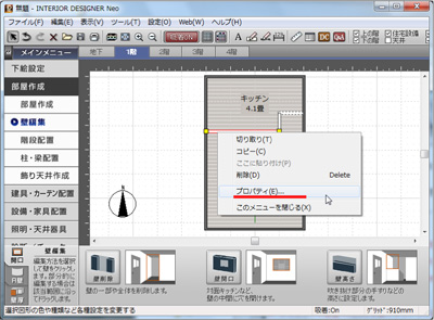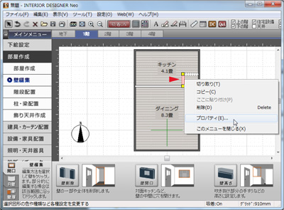 開口する壁を選択して右クリックからプロパティを選択します。 |