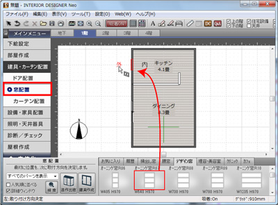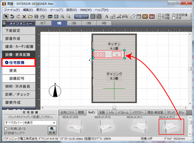 「設備・家具配置」の「住宅設備」を選択してパレットからキッチンを選び部屋に配置します。その後にキッチンパーツの隅にカーソルを近づけて回転します。 |