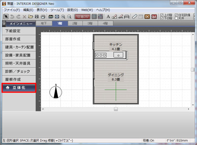 *キッチンのおさまりを確認後に立体化の画面から家具などを配置することもできます。 |