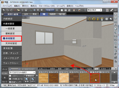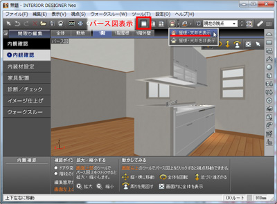 「パース図表示」と「屋根・天井を表示」を選択して、キッチンが間仕切りの壁におさまっているか見回します。 |