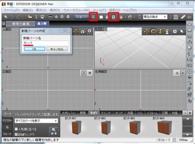 *画面は「グリット表示」と「4面図表示」を選択しておくと配置の位置がわかりやすくなります。 |