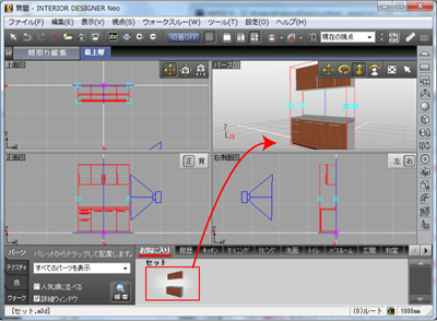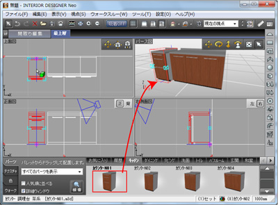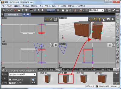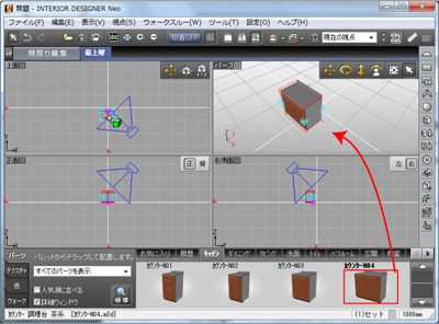 パレットのパーツからキッチンを選択し、「カウンターN04」を画面に配置します。 |