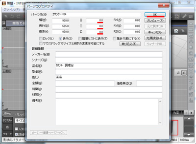 「カウンターN04」をダブルクリックして「パーツのプロパティ」を開き、XYZを「0」にします。OKをクリックします。
