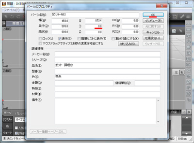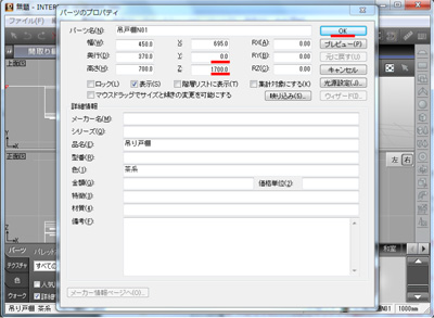 「吊戸棚N03」をダブルクリックして「パーツのプロパティ」を開き、XとYを「0」にして Zは「1700」にします。OKをクリックします
