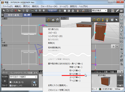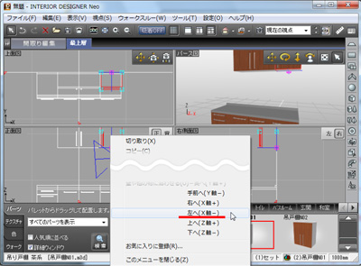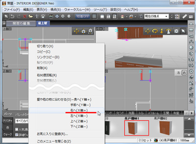 「吊戸棚N01」を選択した状態で右クリックして「壁や他のものに沿わせる/左へ」を選択します。 |