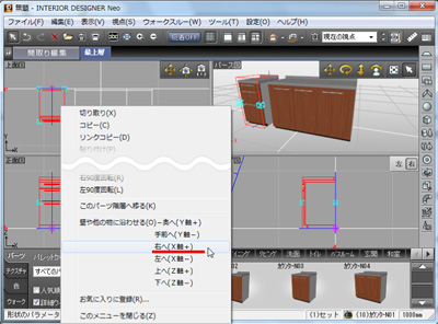 「カウンターN01」を選択した状態で右クリックして「壁や他のものに沿わせる/右へ」を選択します。 |