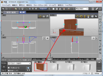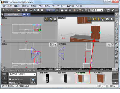 「吊戸棚N03」を「カウンターN04」の上にを配置します。 |
