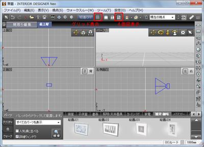 「4面図表示」「グリッド表示」をクリックして位置など全体を確認できるようにします。 |