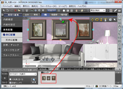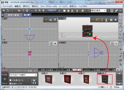 パーツパレットから「雑貨・趣味」をクリックして絵画パーツをドラッグ&ドロップでパース画面に配置します。 |