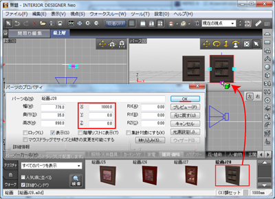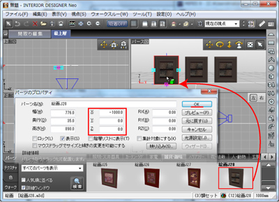 パーツをダブルクリックして「パーツのプロパティを表示」させXYZの数値を変更して「OK」をクリックします。