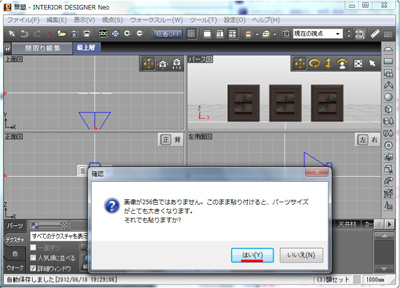 「確認」のメッセージが表示された場合は画像ファイルが256色ではありません。そのまま使用する場合は「はい」をクリックします。