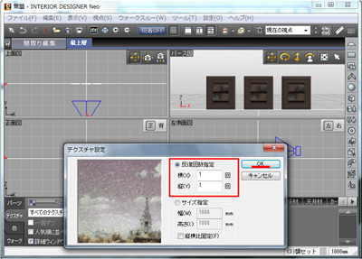 「テクスチャ設定」が表示されます。「反復回数指定」を横1、縦1にして「OK」をクリックします。 |