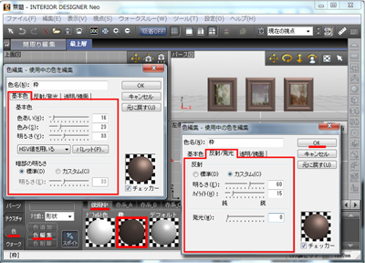 「基本色」「反射/発光」の数値を調整後に「OK」をクリックします。