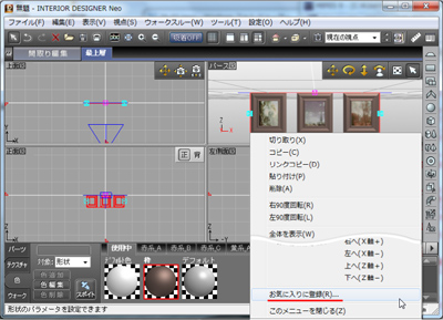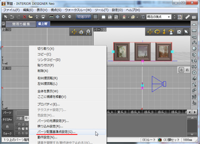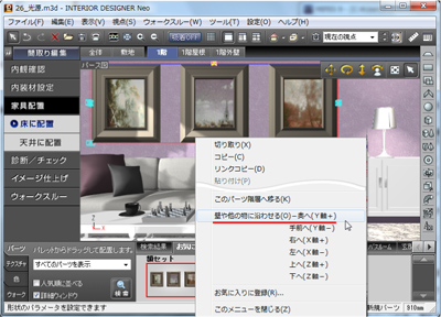 奥の壁に沿わせる場合は壁とパーツの間に他のパーツ等がないことを確認して、額パーツを選択した状態で右クリック「壁や他のものに沿わせる/奥へ」を選択すると、壁に吸着します。 |