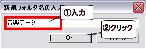 [新規フォルダ名の入力]画面が表示されたら、「音楽データ」と入力し、[OK]をクリックします。