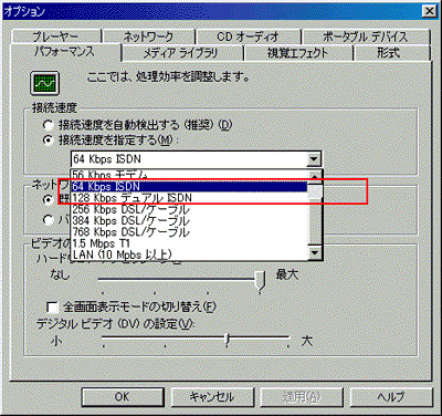 通信速度の変更はWindows Media Player7.0から可能です。 Windows Media Player7.0以前のバージョンでは変更できません。