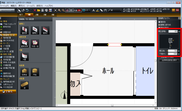 [壁編集プロパティ]で、「開口部幅」と「開口高」にニッチのサイズを入力し、「下端から」に床からの高さを入力します。
