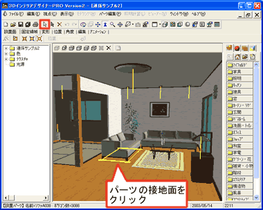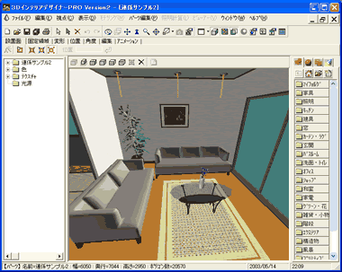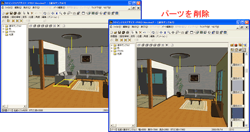 選択したパーツを移動や削除したり、入れ替えたり、また、床や壁のテクスチャを変えたりして室内空間を仕上げていきます。 |