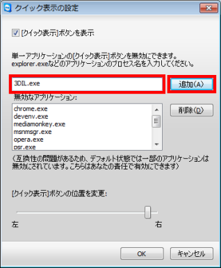 - 表示された[クイック表示の設定]で、入力欄に3D画面を実行するプログラム名「3DIL.exe」と入力し、[追加]ボタンをクリックします。