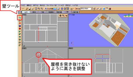 次に「壁」ツールで壁を作成します。(屋根を突き抜けないように注意してください)