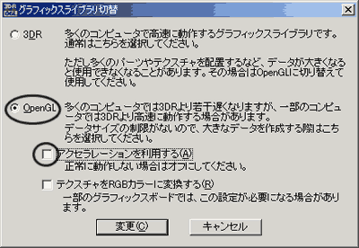 上のようなダイアログが表示されますので、グラフィックスライブラリを「OpenGL」に変更し、「アクセラレーションをONにする」チェック を外してください。 |