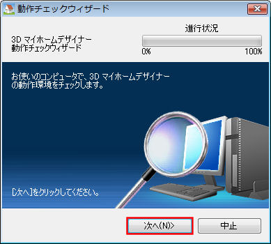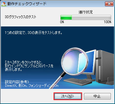 - 動作チェックウィザードの[次へ]をクリックして、チェックを開始します。